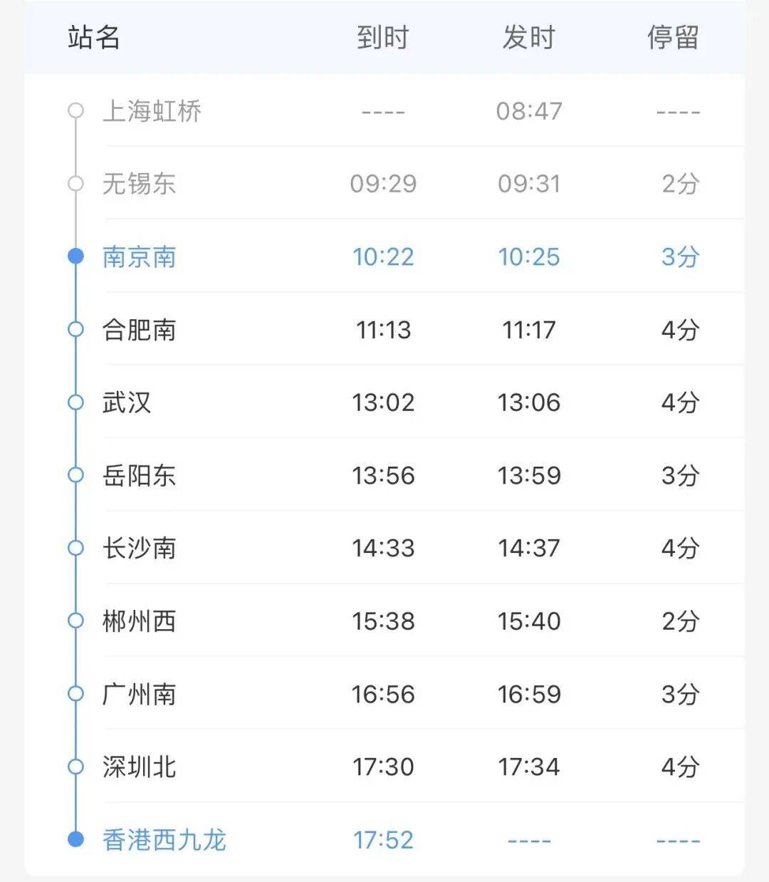 按照12306平台消息,G385次列车由上海虹桥坐始发,10!22抵达南京南坐,10!25从南京南坐出发,17!52抵达西九龙坐,“朝发夕至”的时辰放置极大提拔了搭客的出行便当性;返程G386次列车,14!05从西九龙坐出发,21!10抵达南京南坐,全程耗时7小时05分。